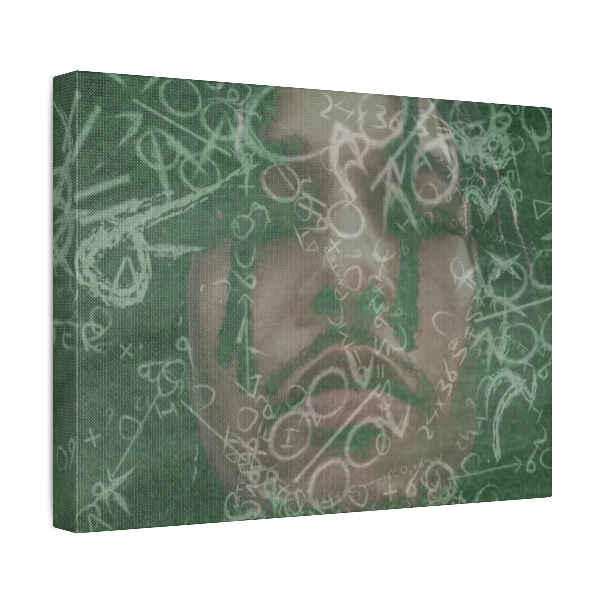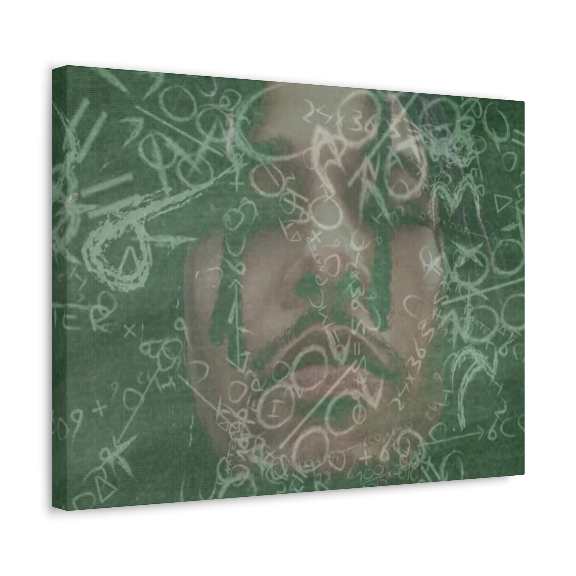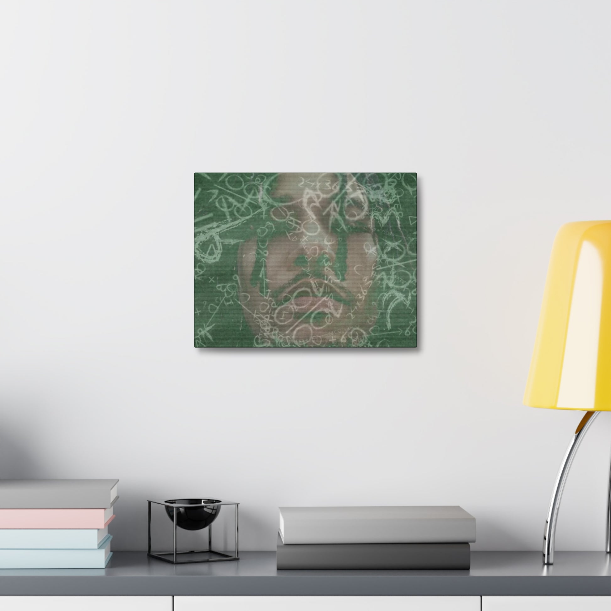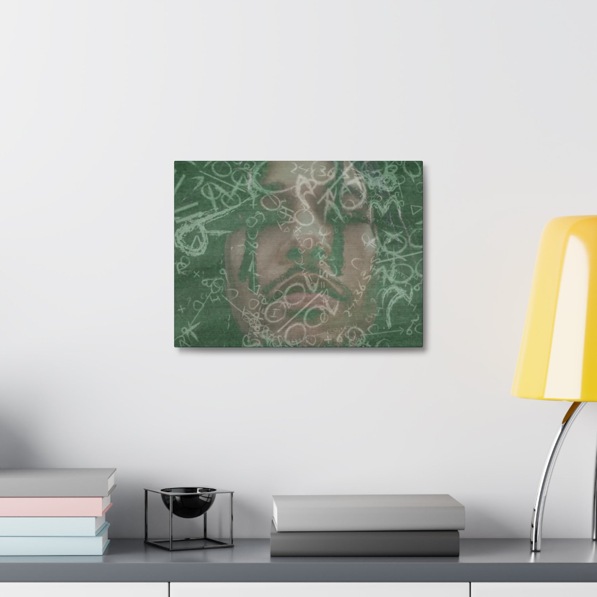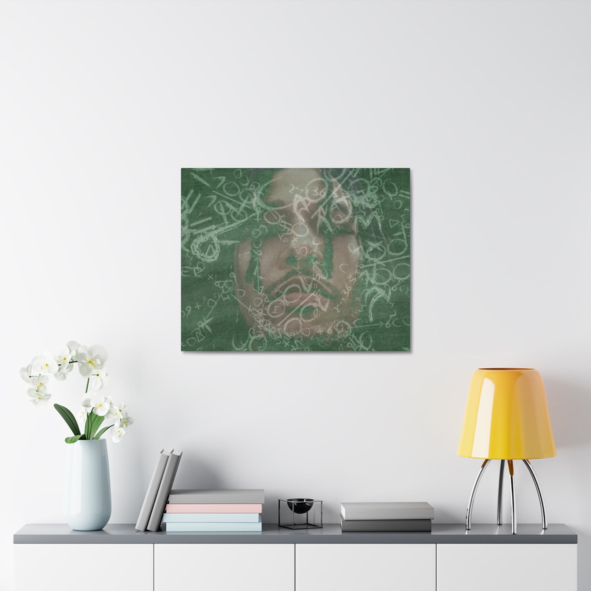 A stretched canvas that turns a bold, urban portrait of A - Math "Math Problem" Album into a textured focal point for your wall. Soft cotton weave and giclée inks bring deep greens and layered chalk-like markings to life, preserving fine facial details and the raw energy of street-inspired scribbles. Hung in a studio, hallway, or living room, this canvas feels like a personal conversation piece — intimate, moody, and tactile. The natural matte finish keeps reflections low so the layered contrasts read clearly from across the room. Designed for indoor display on a simple wooden frame, it adds atmosphere without shouting for attention.
